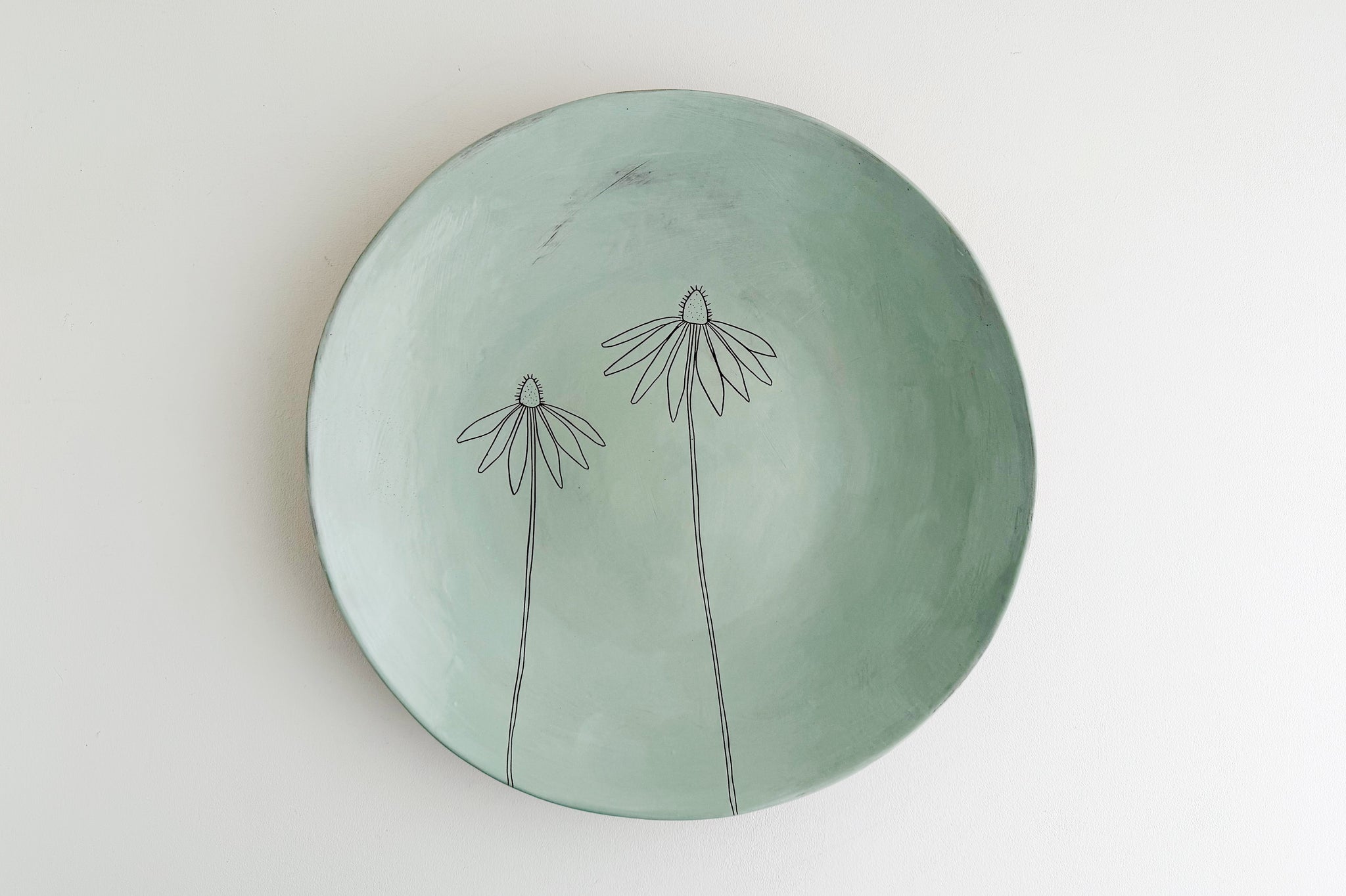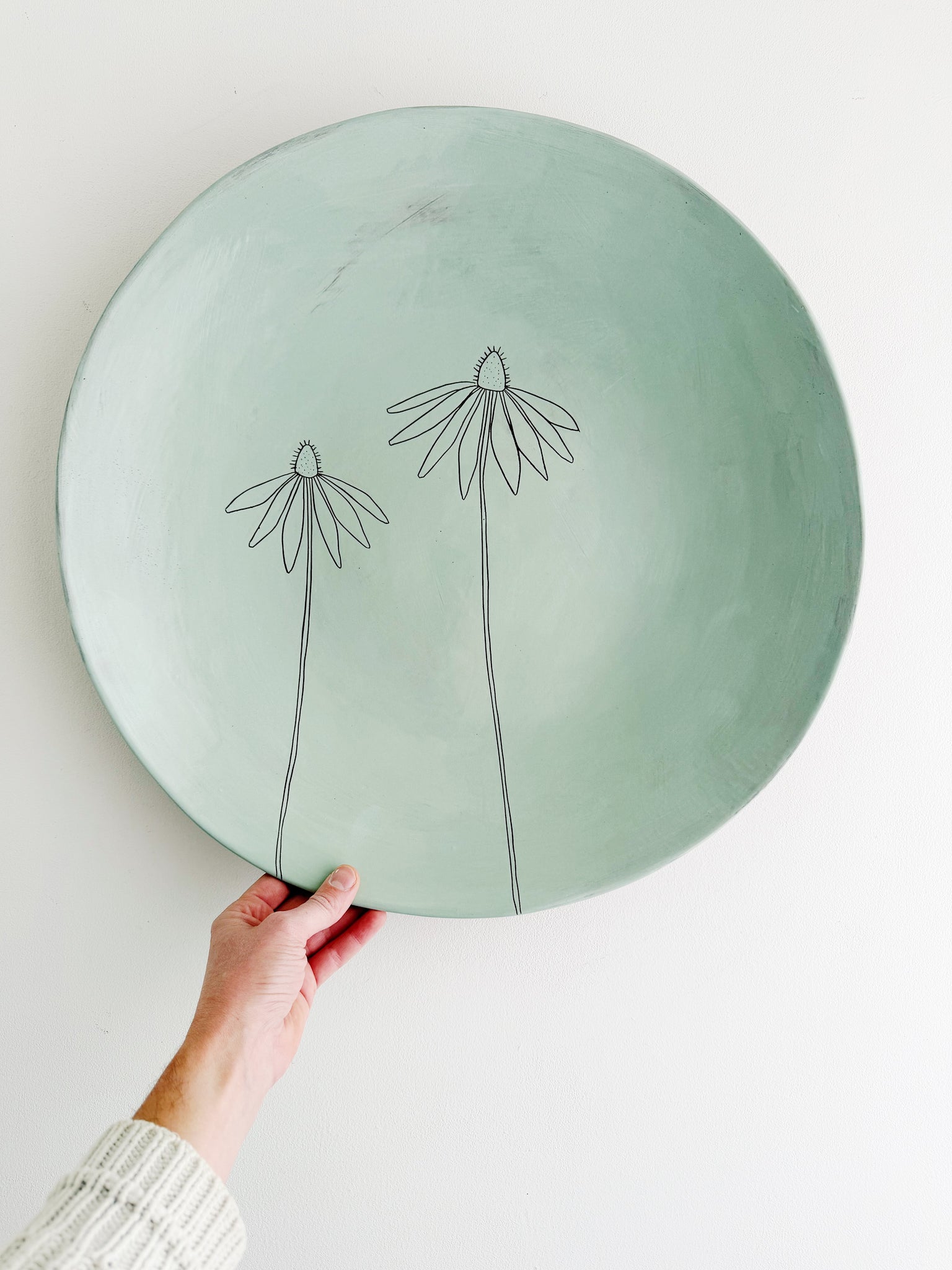 This platter has curved edges, like a shallow bowl. It works well as a statement piece on a table, or to hold fruit or serve a big salad or pasta dish. It makes a wonderful gift, and is a real show-off.