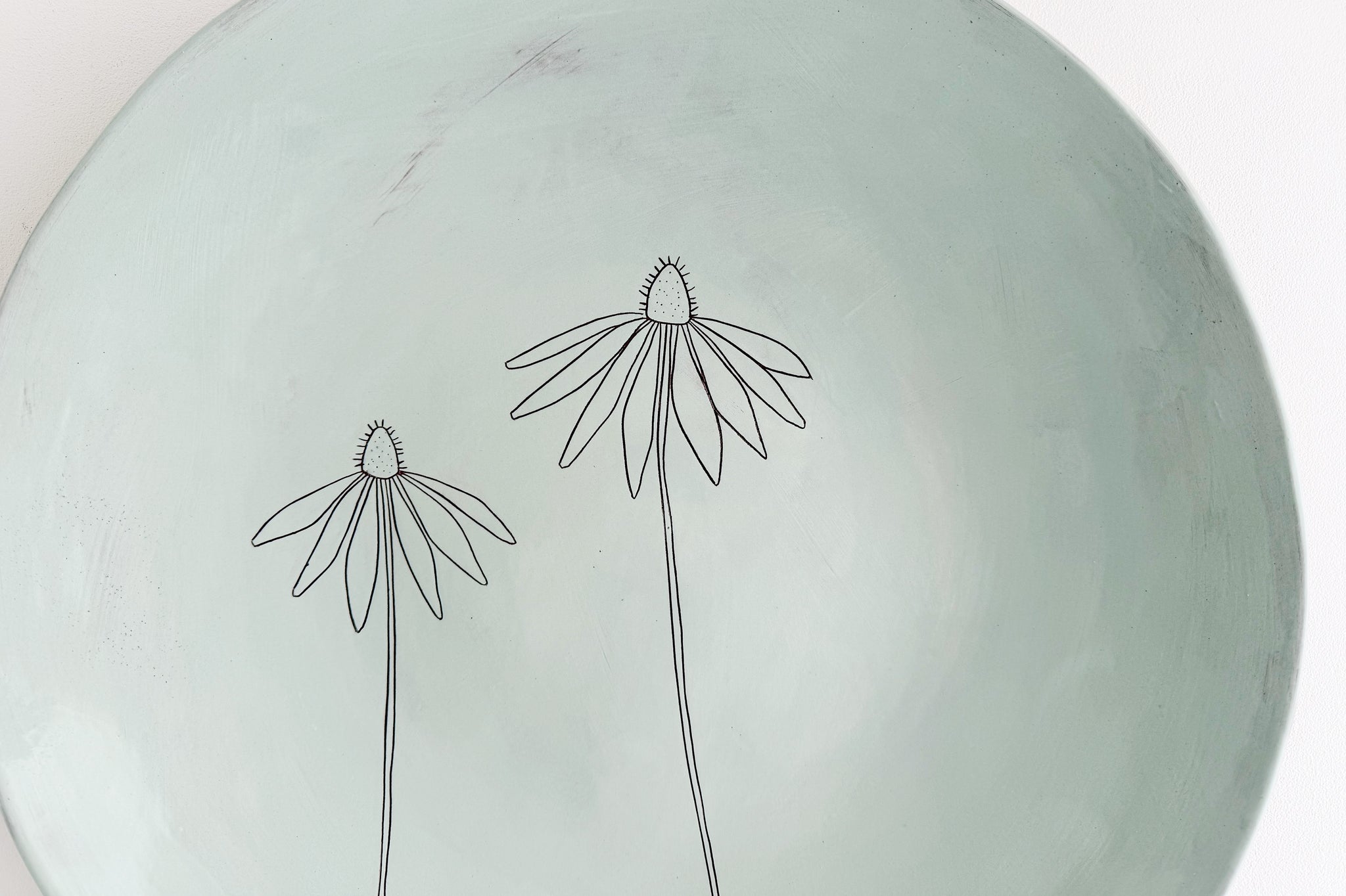 This piece is individually crafted and decorated using earthenware clay and colored underglazes. Each one is hand painted and drawn, so every serving platter is unique. It is finished with a food-safe glaze. The bottom of the serving platter is raw earthenware.
