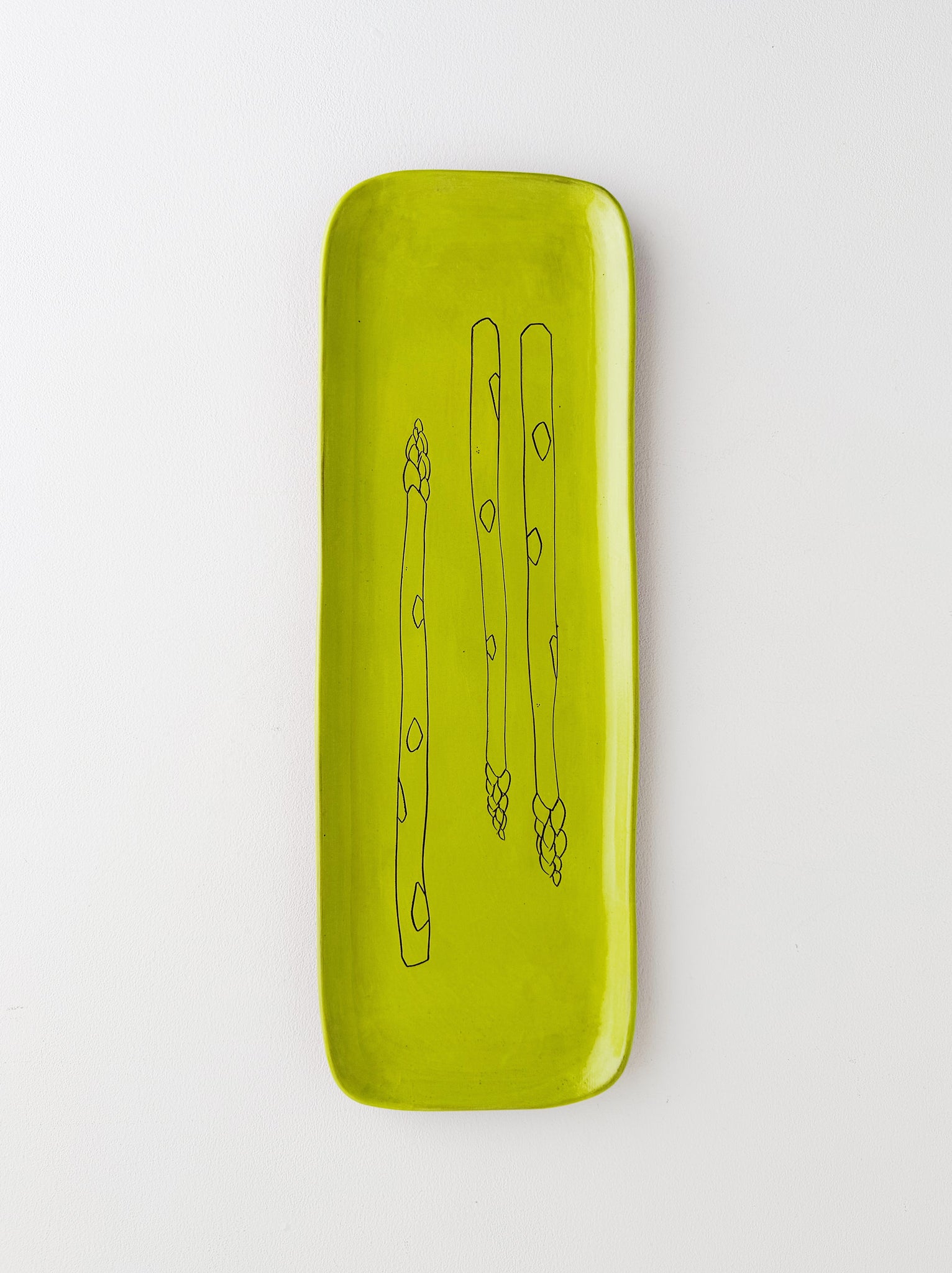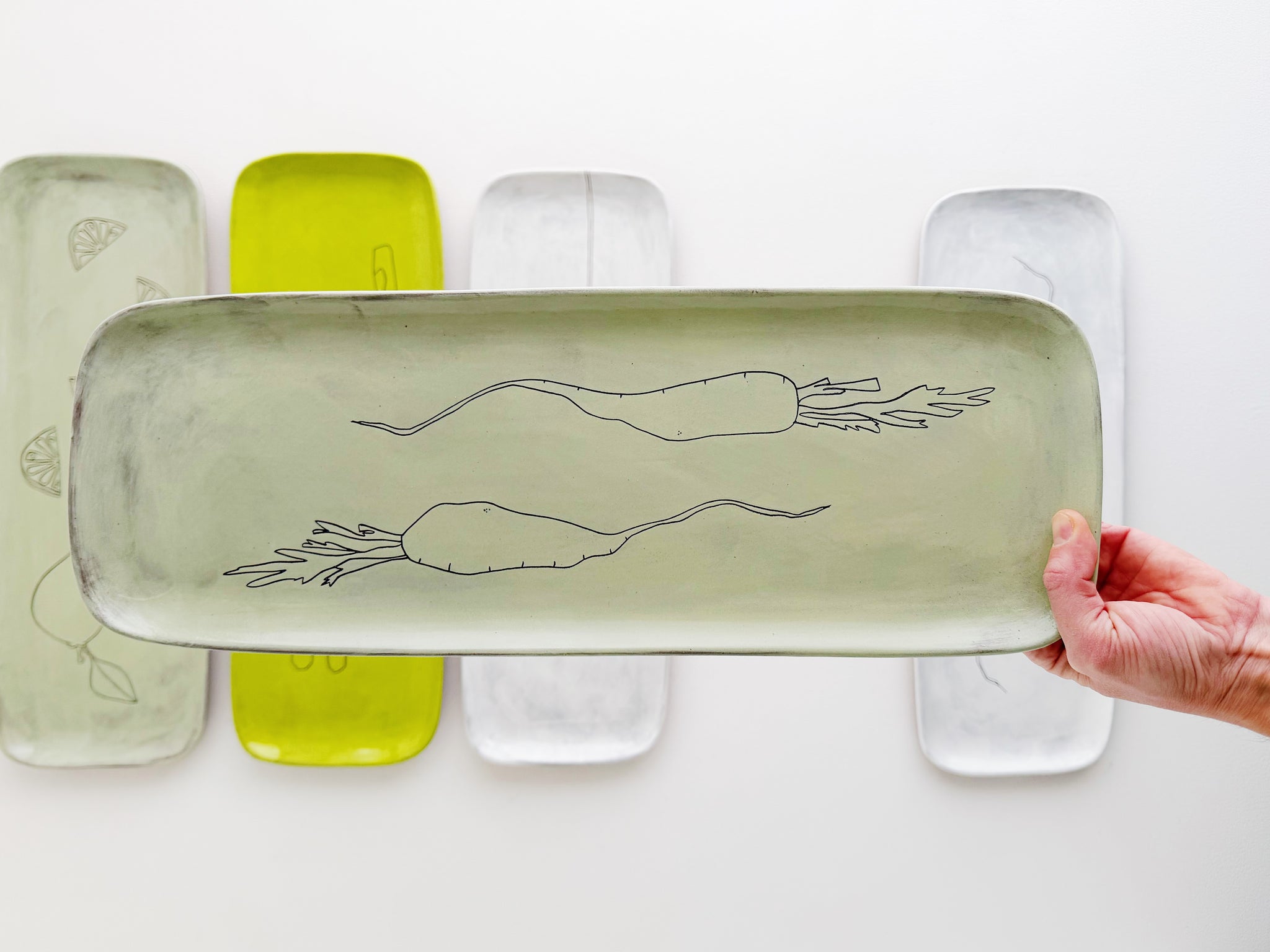 Each platter is individually crafted and decorated using earthenware clay and colored underglazes. Hand-built, painted and completed with an original drawing, every platter is unique and a functional work of art. It is finished with a food-safe glaze. The bottom of the platter is tomato-colored raw terracotta.