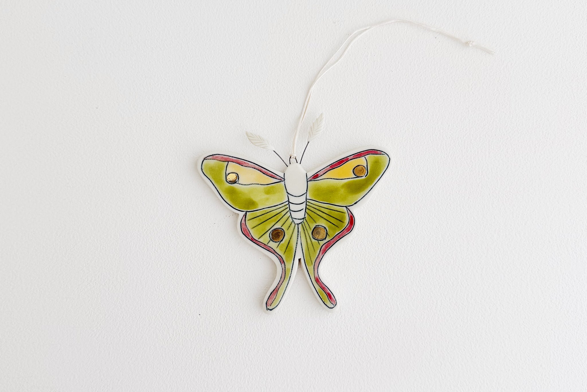 With its chartreuse wings and feathery antennae the moon moth is a whimsical delight. Each moon moth is made from hand carved porcelain which is then inlaid with underglaze and painted with 3 underglaze washes. 22K gold lustered accents complete these heirloom quality ornaments.