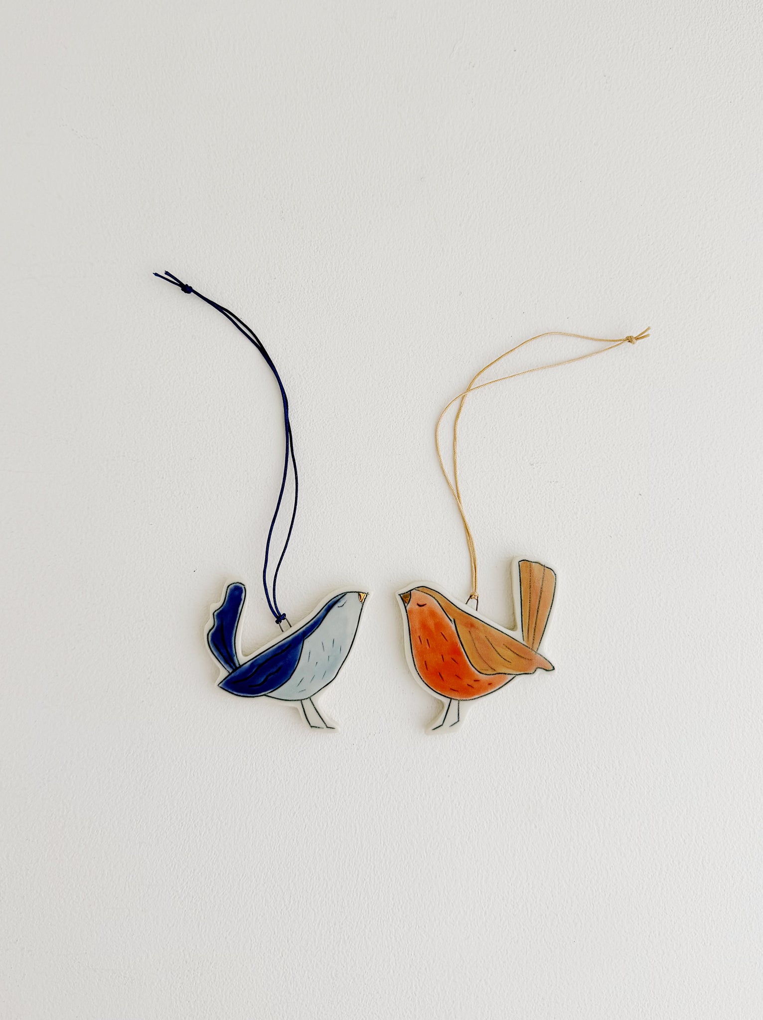 Sold only as a pair, the birds of a feather are hand made from porcelain, individually carved and inlaid with underglaze then painted with underglaze washes. Finished with a clear gloss glaze and 22k gold, the birds of a feather pair make the perfect addition to your holiday decor or to top any gift.