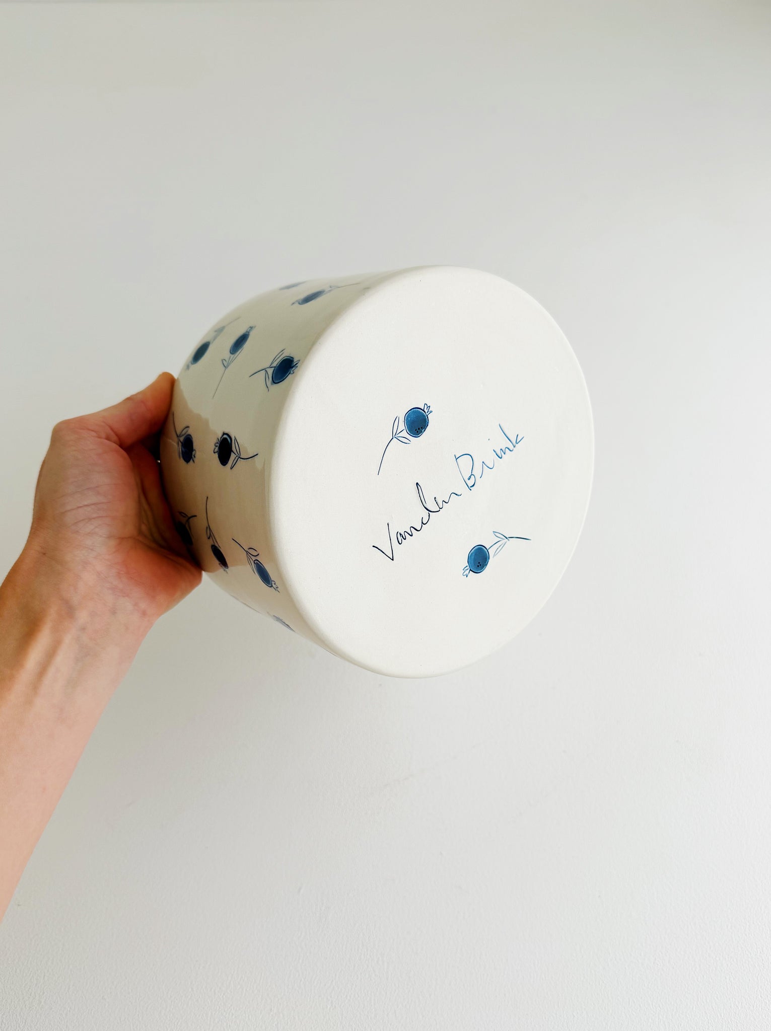 Each bucket bowl is wheel thrown with porcelain clay, hand carved, inlaid with underglaze, painted with an underglaze wash and finished with a clear gloss glaze. Each piece is unique, with some variation, since every one is created and decorated by hand.