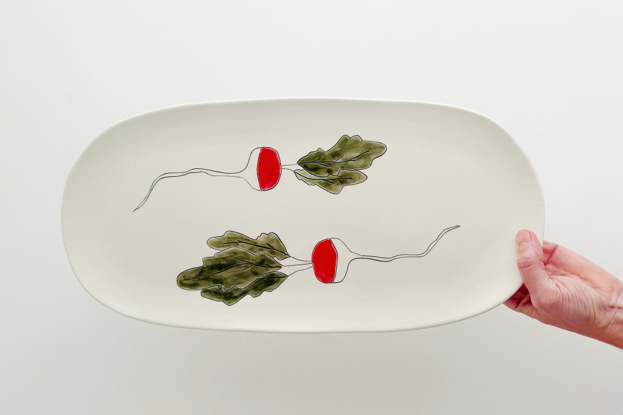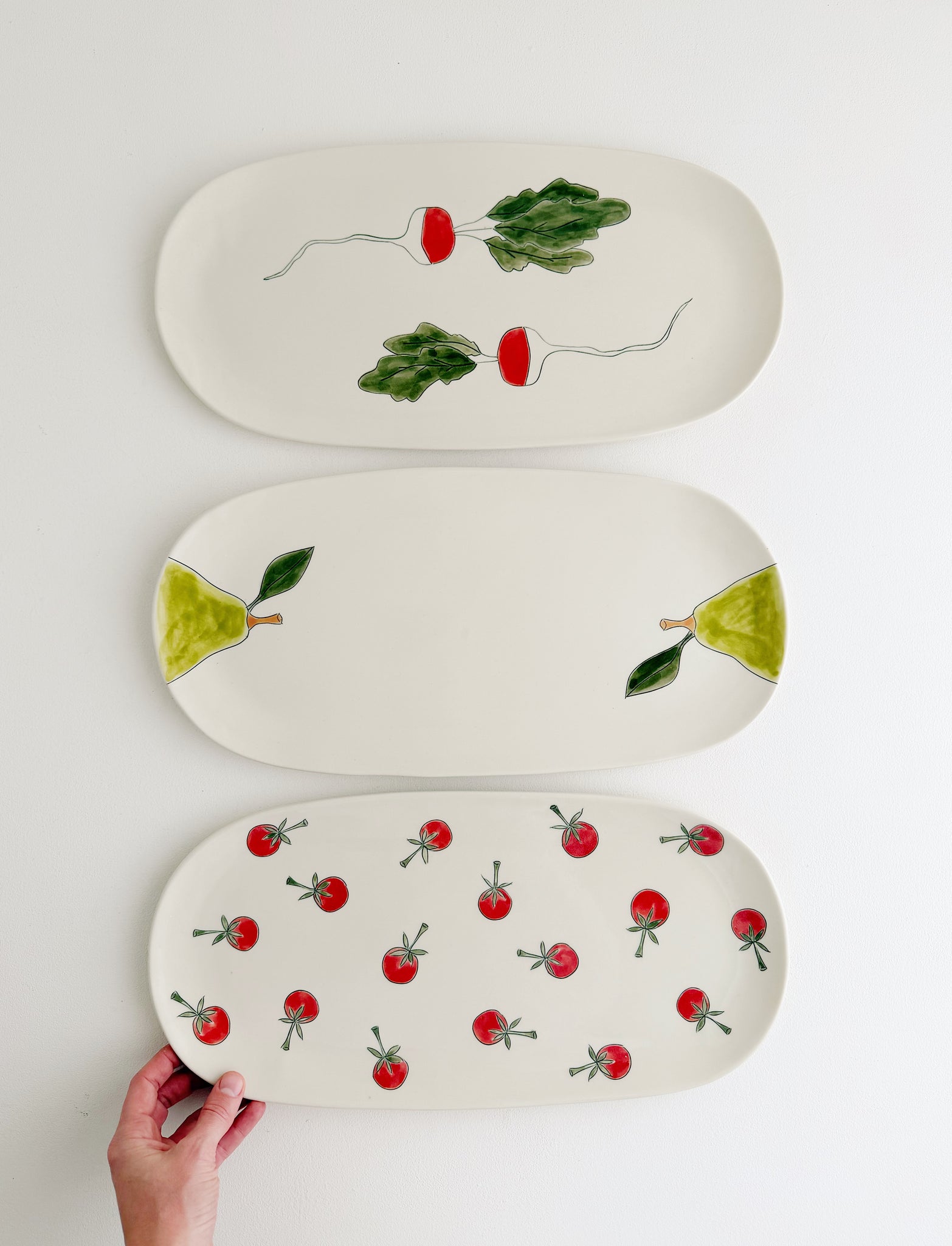Summer platters are handmade with porcelain clay, hand carved, inlaid with underglaze, painted with a watercolor underglaze washes and finished with a food safe clear gloss glaze.Each piece is unique, with some variation, since every one is created and decorated by hand.