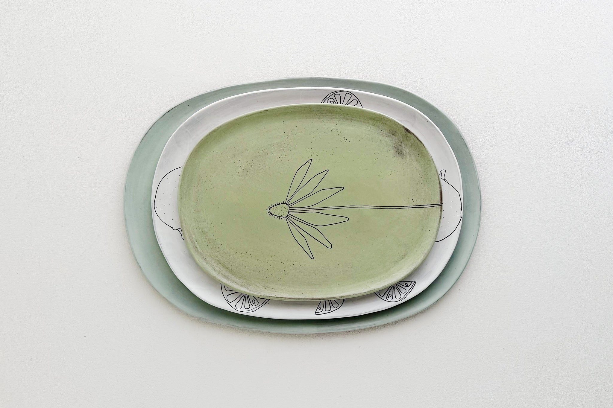 This piece is individually crafted and decorated using earthenware clay and colored underglazes. Each one is hand painted and drawn-on, so every platter is unique. It is finished with a food-safe glaze. The bottom of the platter is raw earthenware.
