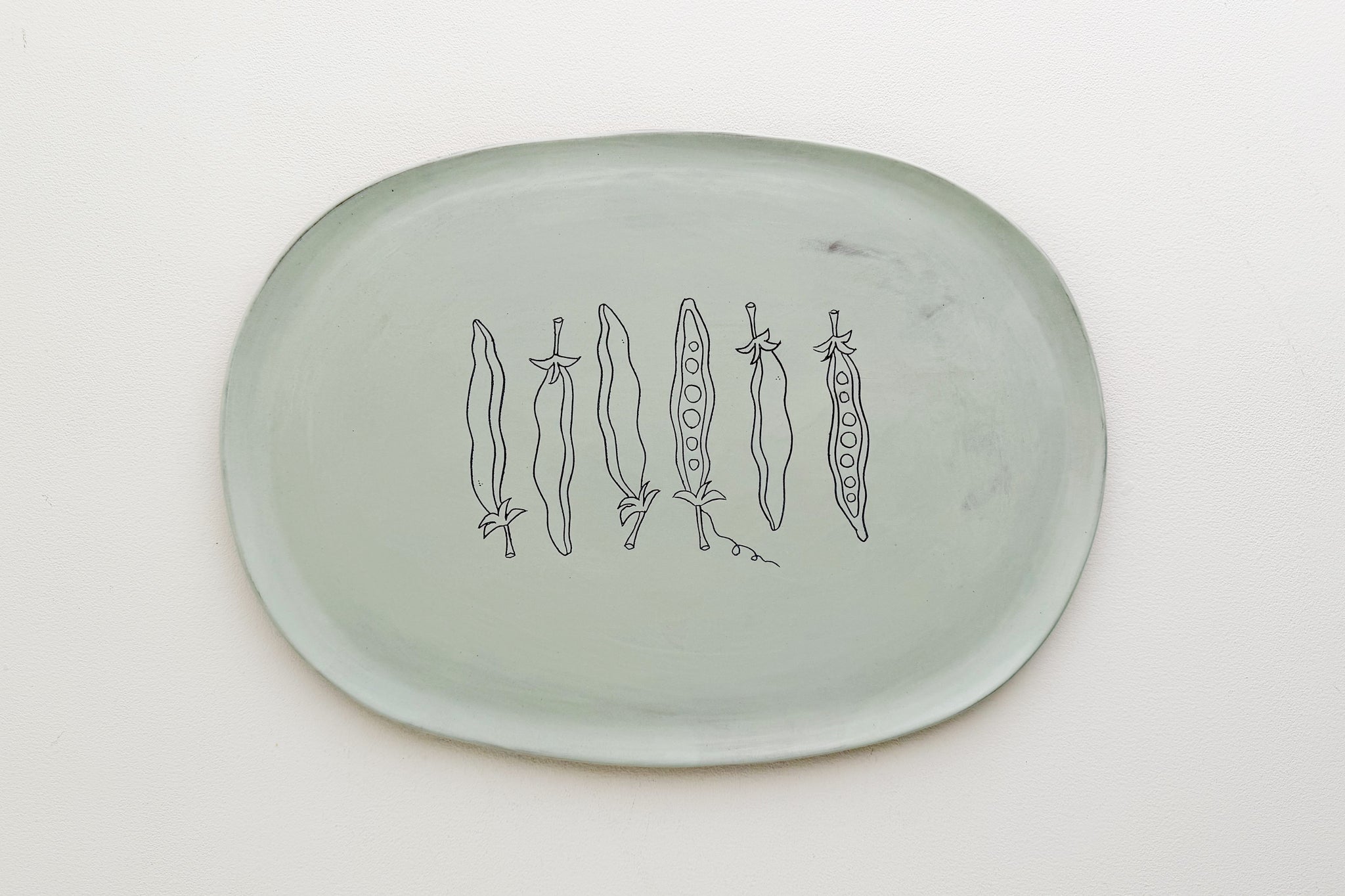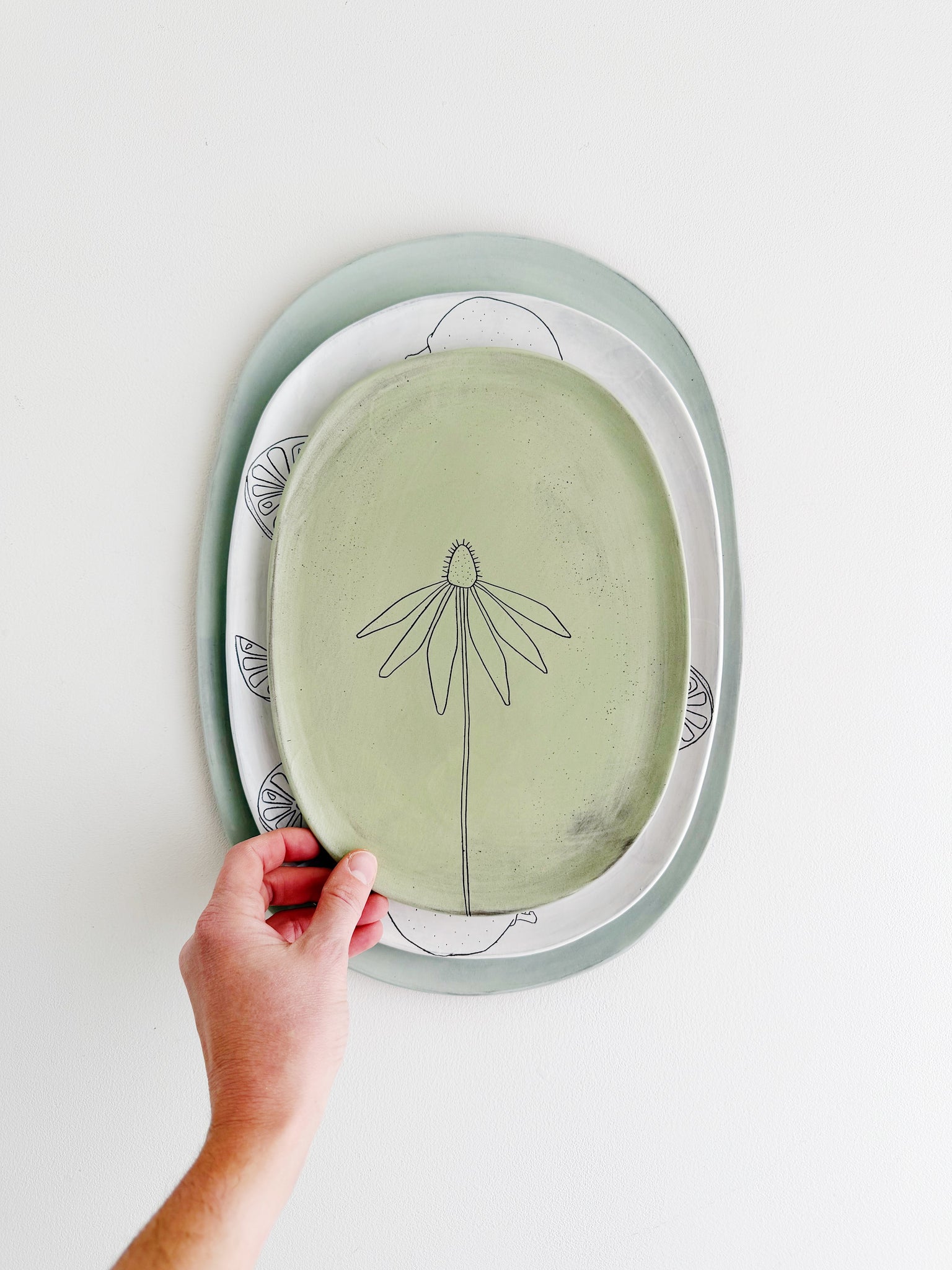 This piece is individually crafted and decorated using earthenware clay and colored underglazes. Each one is hand painted and drawn-on, so every platter is unique. It is finished with a food-safe glaze. The bottom of the platter is raw earthenware.
