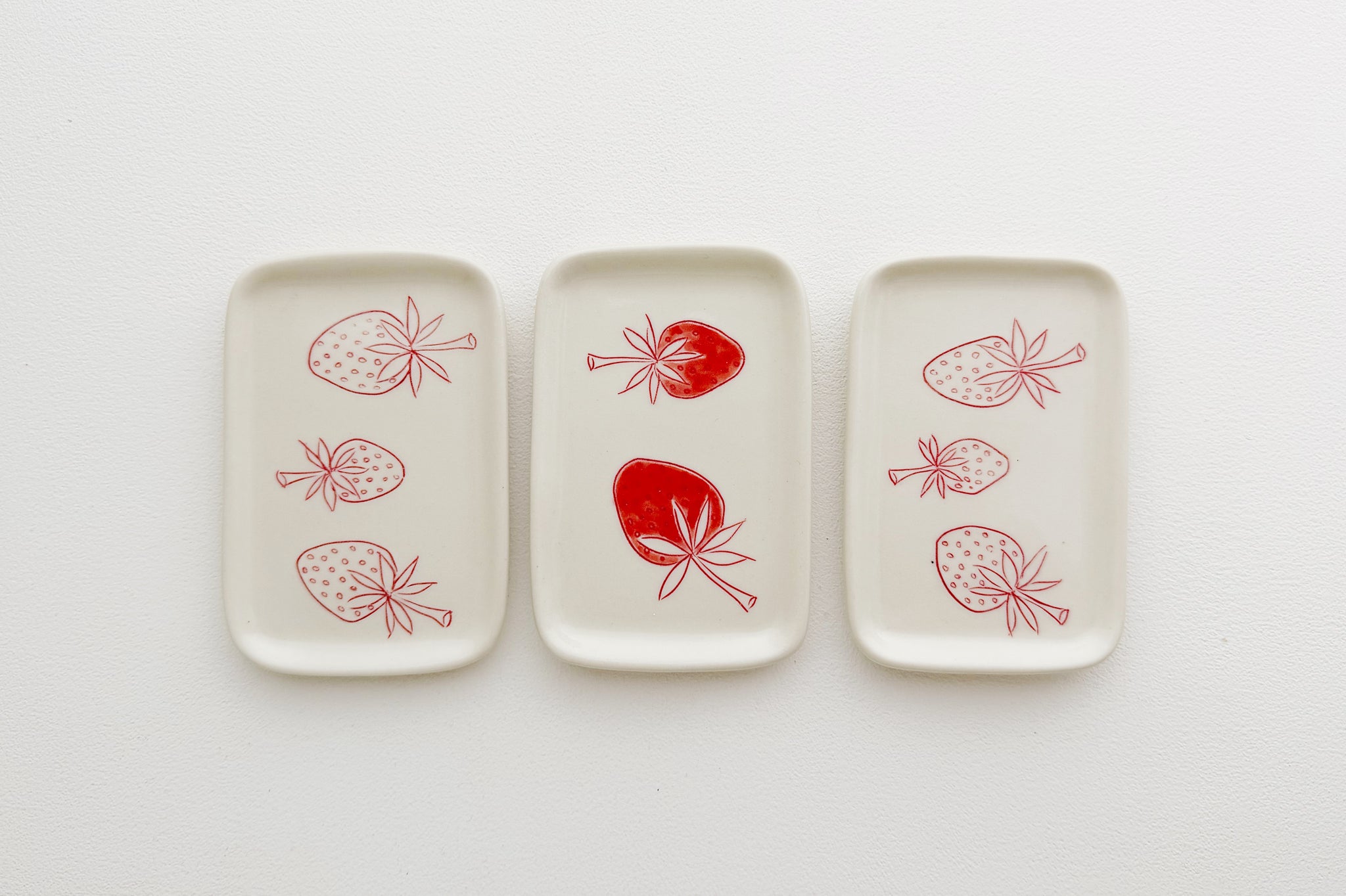 Strawberry catch-all trays are handmade of porcelain clay, hand carved, inlaid with a bright warm red underglaze, painted with a watercolor underglaze wash and finished with a food safe clear gloss glaze.