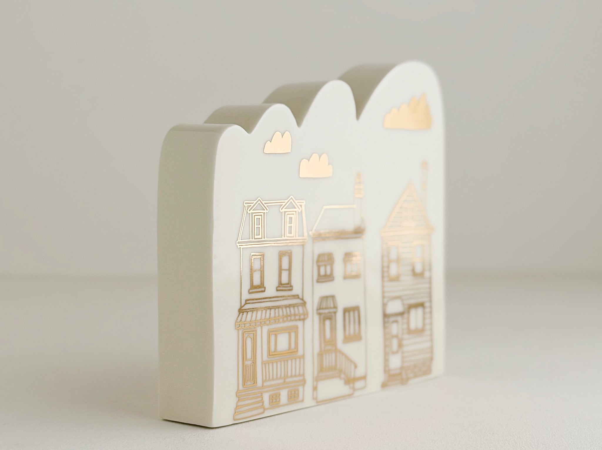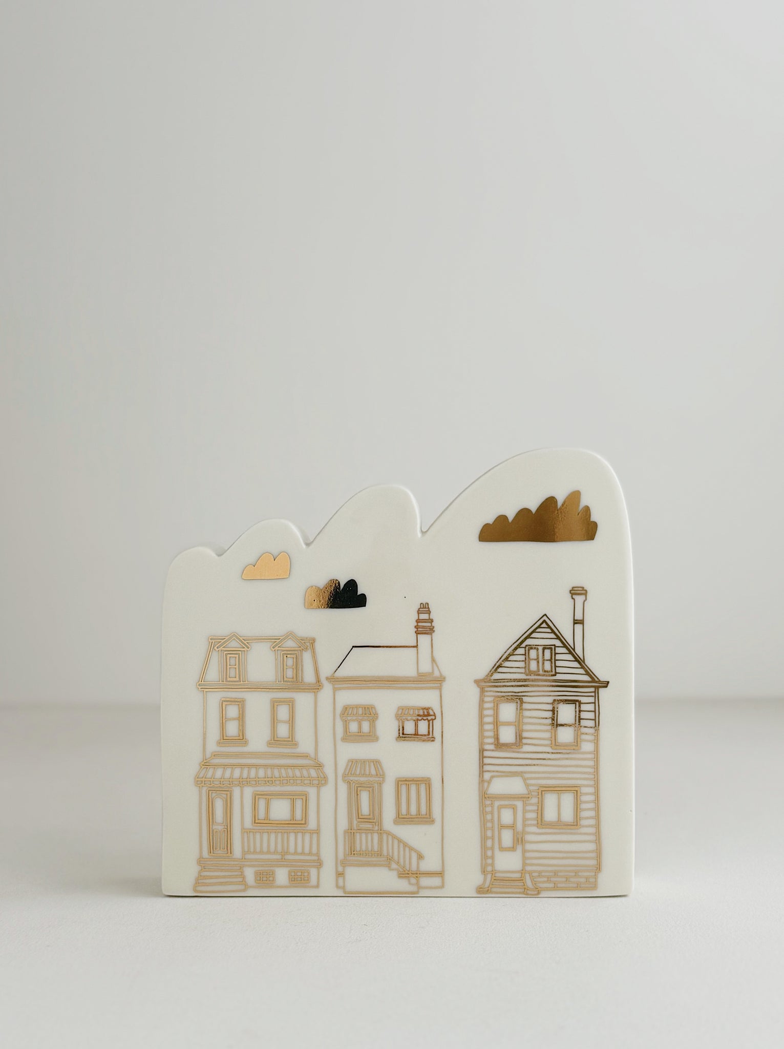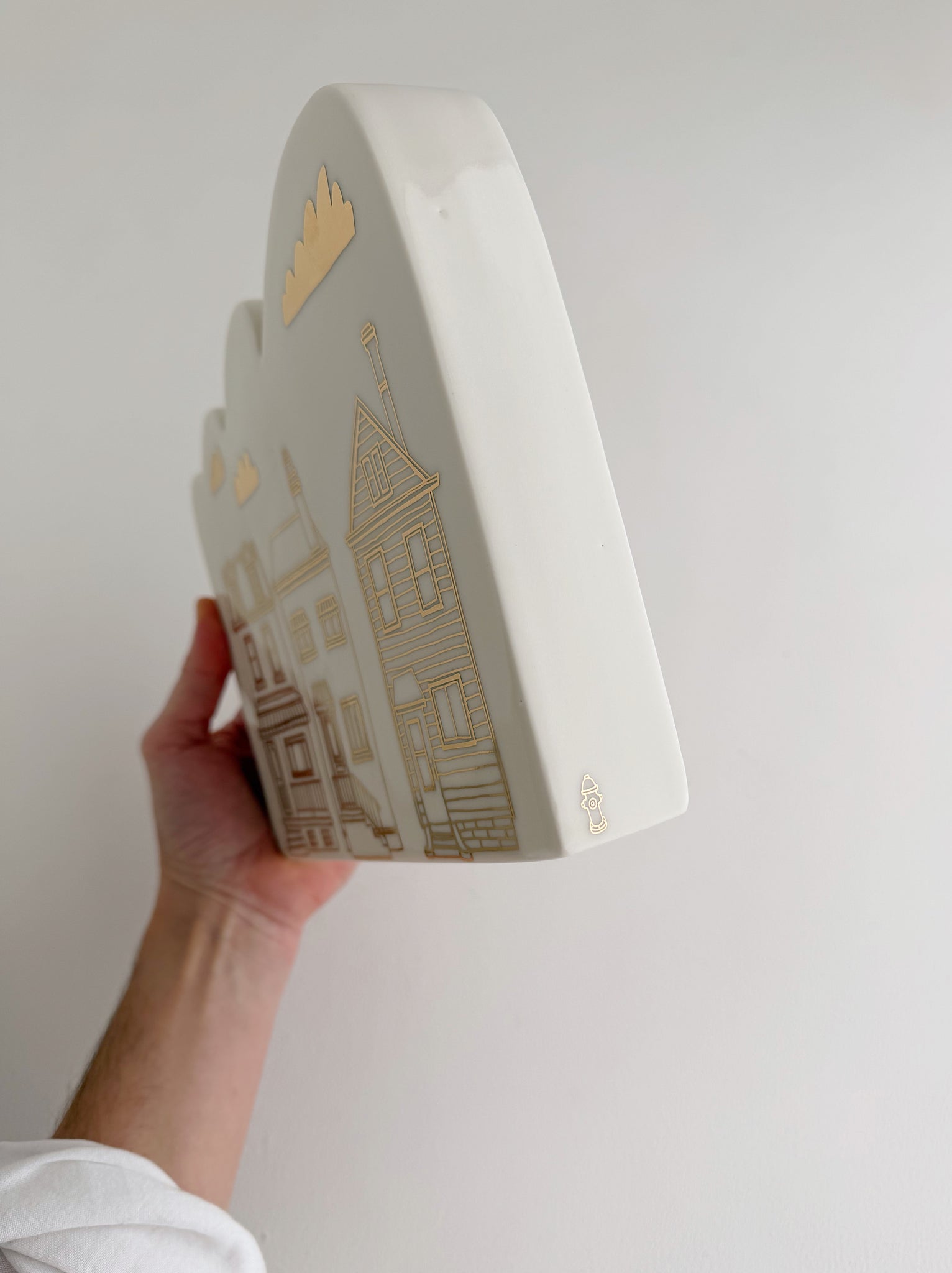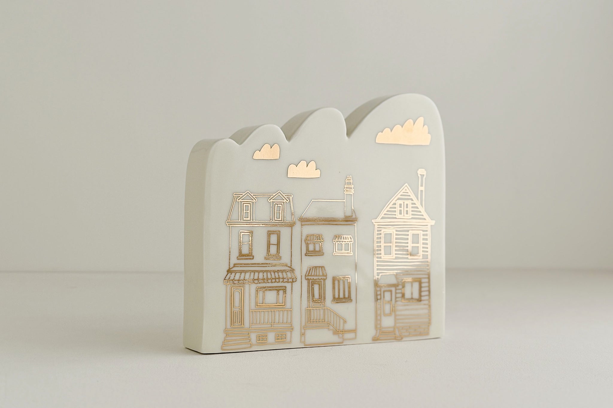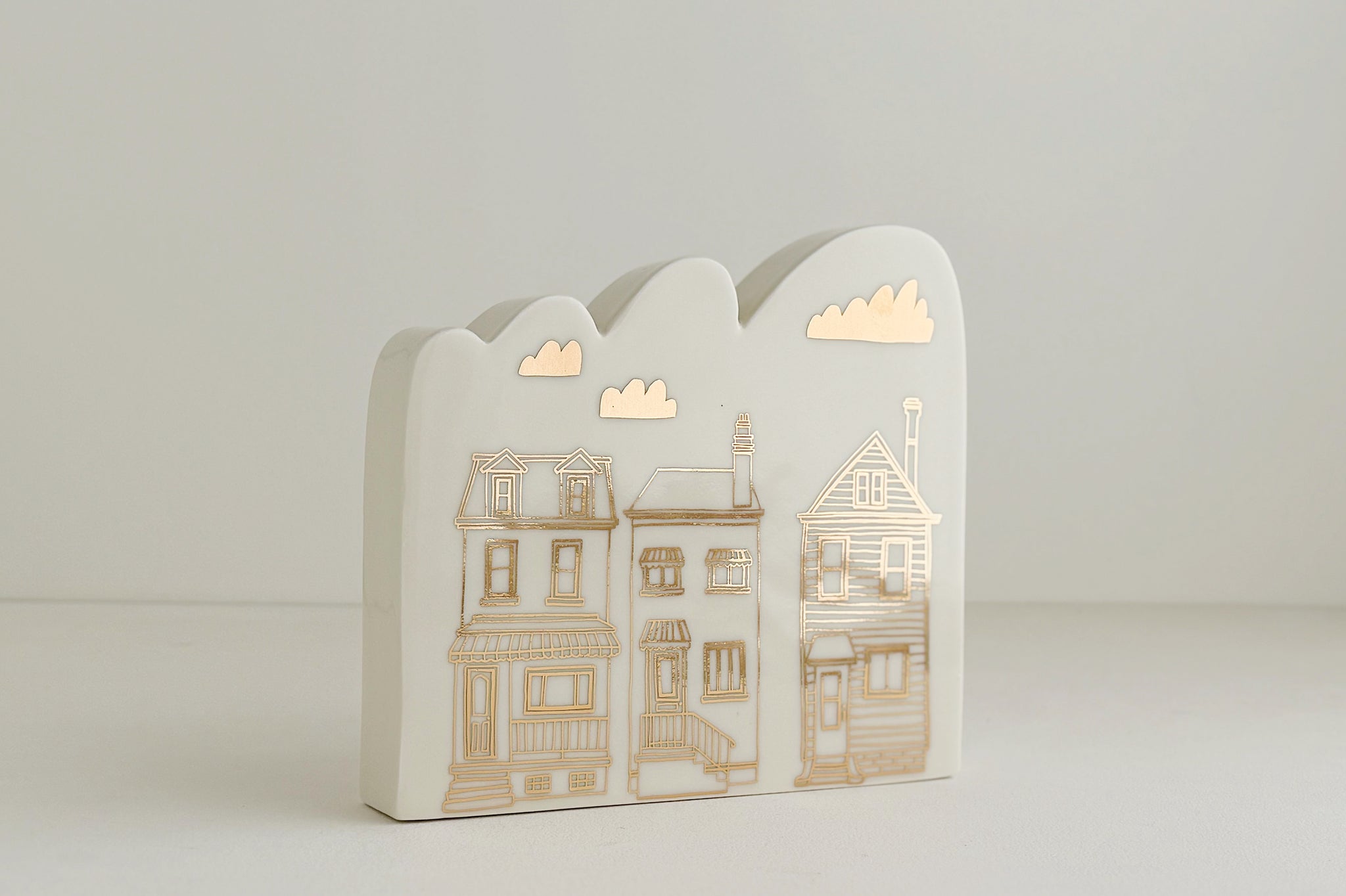 The Neighborhood cloud sculpture features illustrations drawn by Abbie Adams of Abbie Adams Studio exclusively for this limited edition collaboration. Done in her signature style, these houses are inspired by Pittsburgh's architecture and friendly neighbors. Peak “around the corner” for a whimsical tiny fire hydrant.