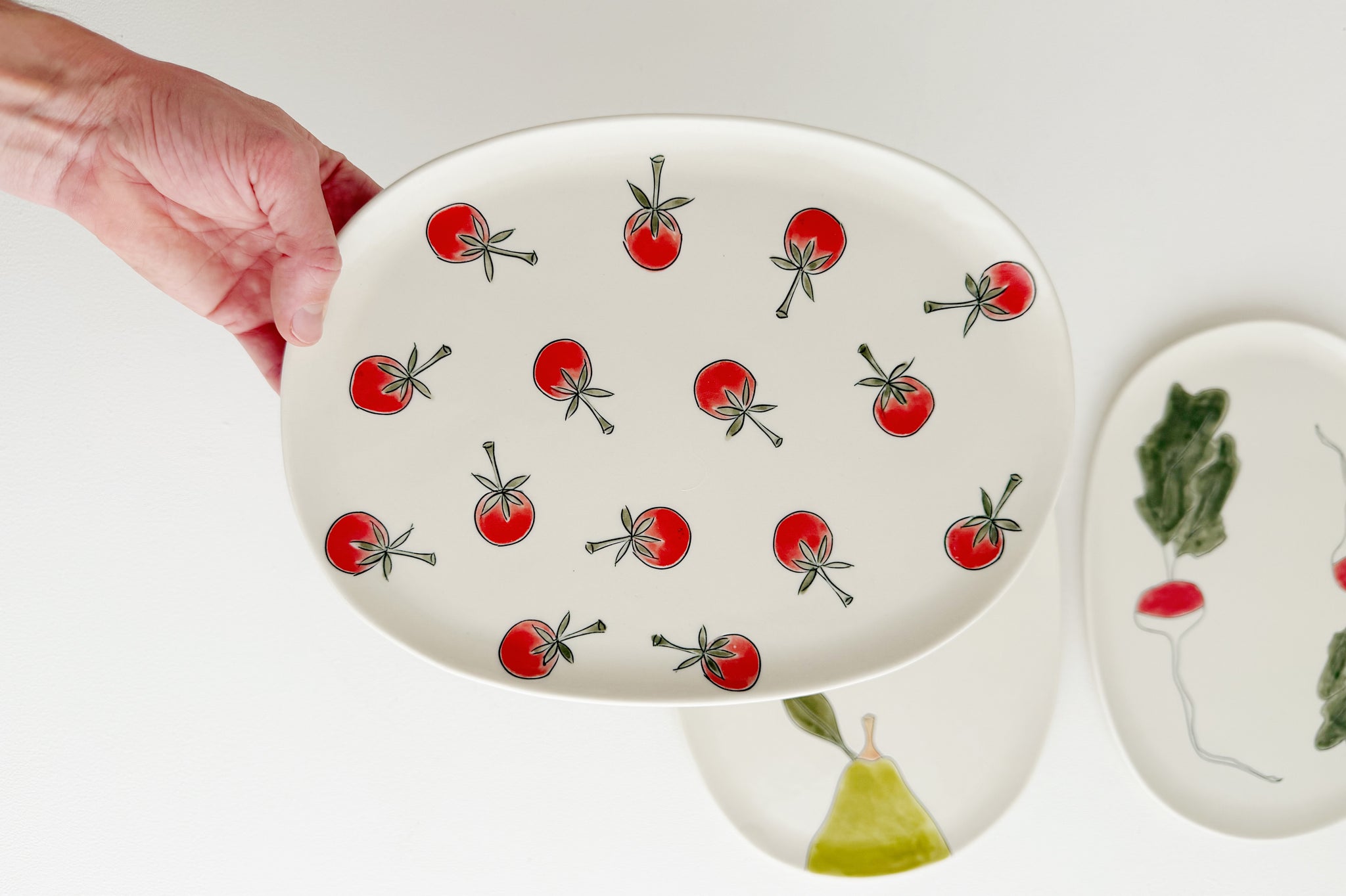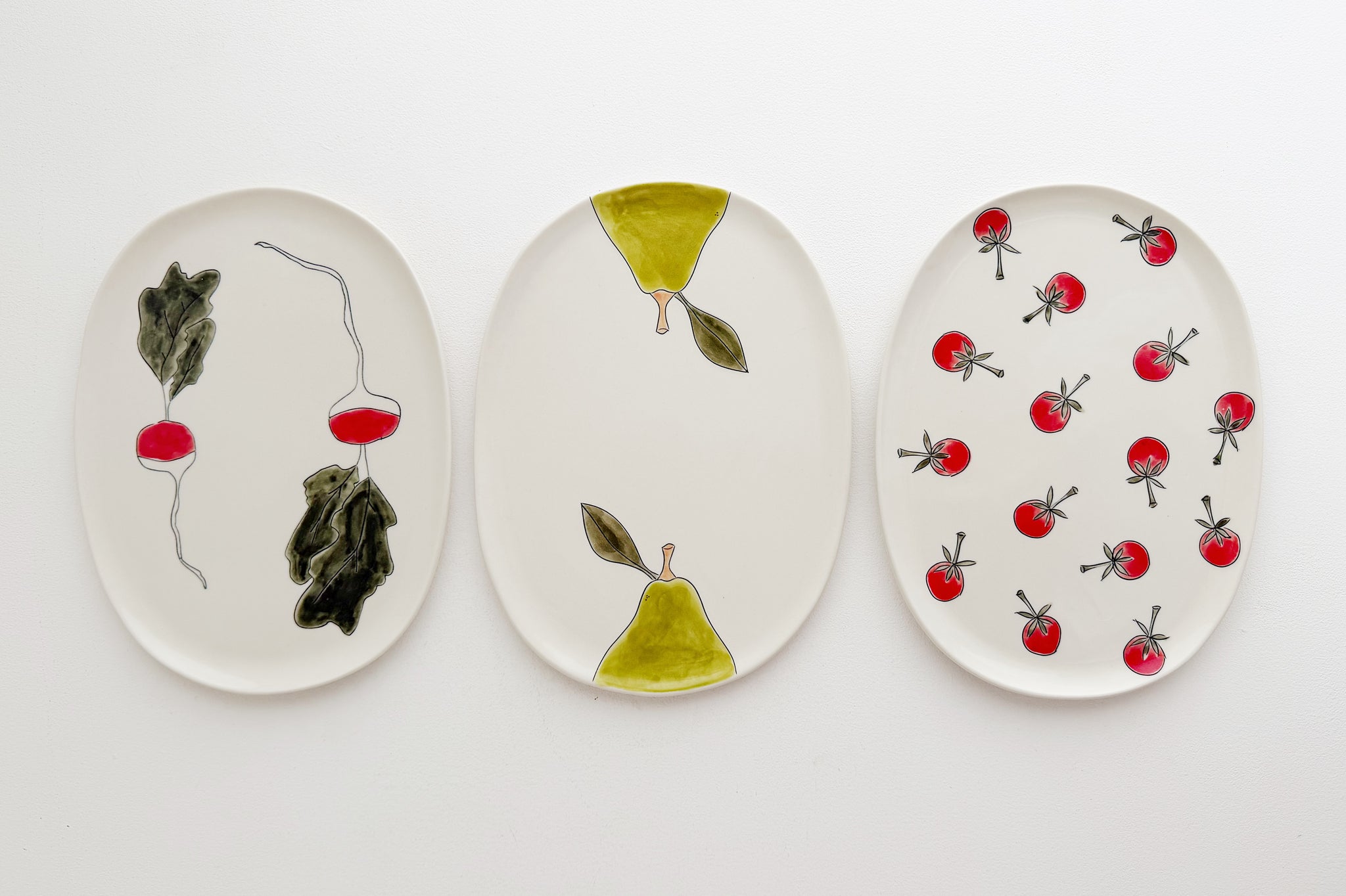 Oval nesting trays are handmade with porcelain clay, hand carved, inlaid with underglaze, painted with a watercolor underglaze washes and finished with a food safe clear gloss glaze.